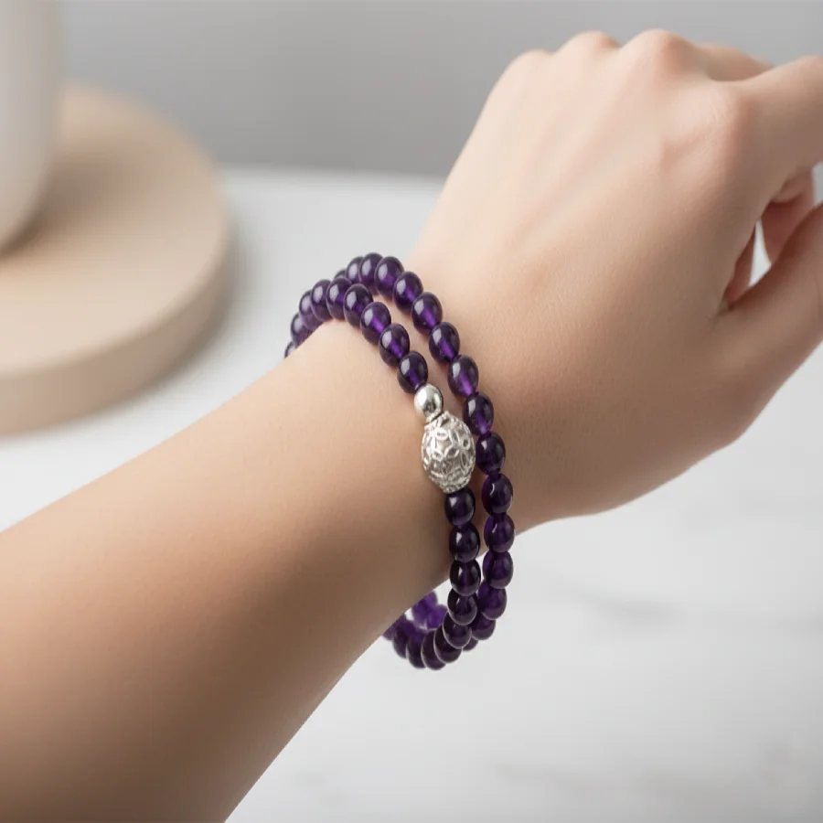 The Amethyst Bracelet enhances intuition, emotional balance, mental clarity, restful sleep, and protection from negative energies while promoting inner peace and positivity.